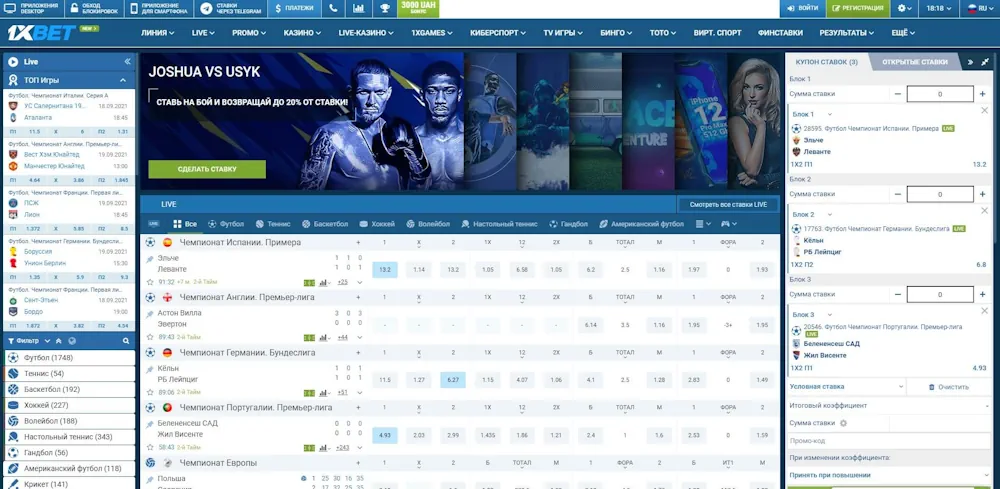 В разделе “Линия” размещены тысячи спортивных событий ежедневно, а в “Live” — матчи, проходящие в режиме реального времени.