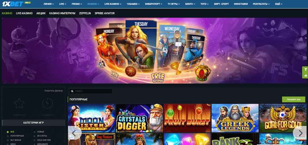 Игровой зал 1xBet включает огромное разнообразие автоматов, и именно слоты занимают здесь центральное место. Каталог постоянно расширяется и включает как классические аппараты, так и современные видеослоты с уникальными механиками, 3D-графикой и бонусными функциями.
