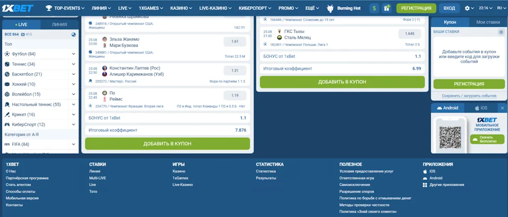 Регистрация на платформе 1xBet занимает минимум времени и открывает доступ ко всем возможностям сайта: спортивным и киберспортивным ставкам, live-линии, игровым автоматам, live-казино, бонусам, турнирам и финансовым операциям. После создания аккаунта пользователи могут пополнять счёт, выводить выигрыши, участвовать в акциях и настраивать персональные параметры профиля.